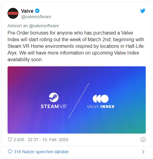 В Твиттере Valve объявляет дату выхода Half-Life: Alyx : 23 марта. Если вы заказываете Valve Index и получаете право на бонус предварительного заказа Alyx, вы получите первые бонусы, такие как среда SteamVR в стиле Half-Life: Alyx, со 2 марта.