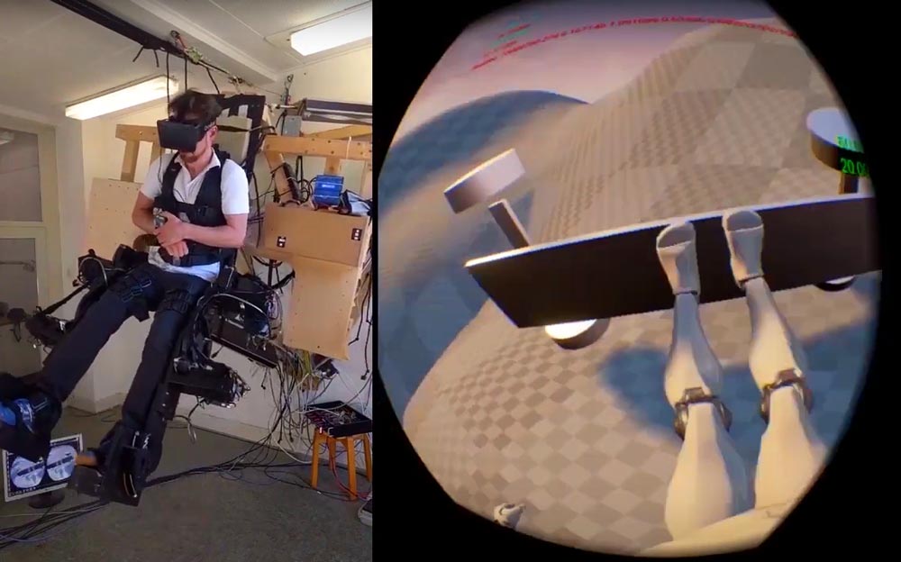 Двигатели на бедрах и коленях создают движущие силы, соответствующие происходящему в VR. Команда разработала демонстрационные ролики, в которых Риз поднимается по лестнице в экзоскелете, балансирует на скейтборде или получает удар тяжелым мячом. Их можно увидеть в следующем видео.