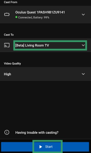 Выберите телевизор, на который хотите транслировать, установите высокое качество видео и нажмите «Start»: