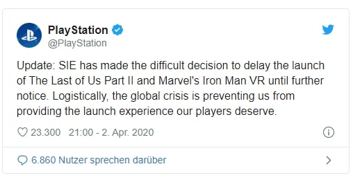 Теперь следует уже третья отсрочка. В этот раз причина, по-видимому, иная: официальный твит утверждает, что глобальный кризис, вызванный эпидемией коронавируса, материально не позволяет тайтлу получить доступ к рынку, которого заслуживают игроки. Sony, по-видимому, ожидает связанные с кризисом проблемы в производстве и поставке игры.