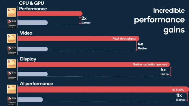 Хотя фактическая производительность CPU и GPU еще точно не известна, Qualcomm заявляет об увеличении производительности в 2 раза при переходе с Snapdragon 835 на XR2. Qualcomm также заявляет, что пропускная способность видео увеличена в 4 раза, поддержка разрешения в 6 раз, а производительность ИИ в 11 раз. Qualcomm также соединяет XR2 5G со своим последним модемом Snapdragon X55, поэтому он может обеспечить связь для некоторых устройств VR и AR — хотя, конечно, элемент 5G платформы является дополнительным.