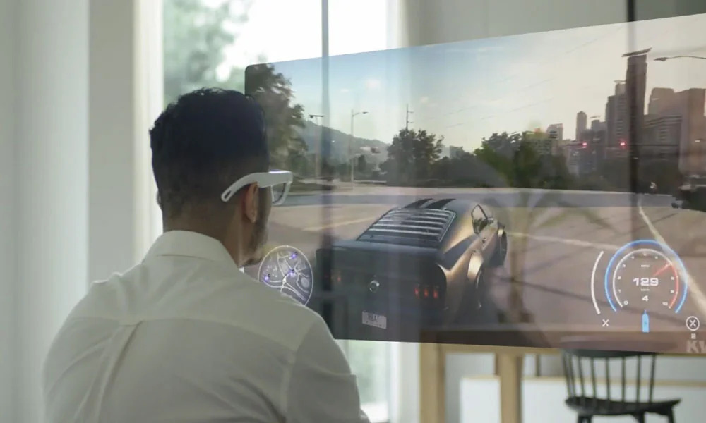 Около года назад под названием проекта «Next Wearable Computing» появились концептуальные видеоролики о видении Samsung AR: тонкие очки для передачи данных, которые используются, в частности, для цифровых дисплеев и в сочетании с клавиатурой, которая также проецируется, могут заменить ноутбук.