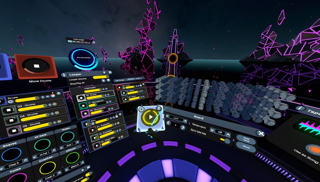 В набор входят шесть инструментов и микрофон, созданные для виртуальной реальности, так что вы можете создавать музыку, используя живое зацикливание, позволяющее вам записывать все, от эмбиента до хип-хопа или динамичного техно.