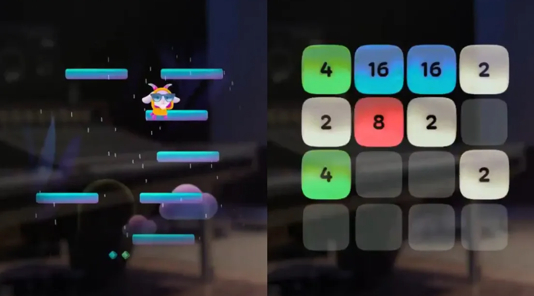 Две новые мини-игры с управлением через EMG: GOAT и 2048. Первая представляет собой упрощённый аналог Doodle Jump, где игрок управляет прыгающей козой, касаясь большого пальца указательным. Вторая — классическая головоломка 2048, адаптированная под управление жестами. Обе игры используют технологию *Meta Neural Band для распознавания движений пальцев.